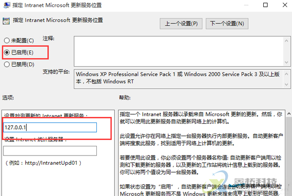 6、將“未配置”框選為“已啟用”。在“設(shè)置檢測(cè)更新的Intranet更新服務(wù)”填寫127.0.0.1 (注:127.0.0.1為本機(jī)IP)。