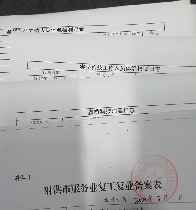 我公司已嚴(yán)格按照復(fù)工復(fù)業(yè)要求取得相關(guān)備案審批資格,現(xiàn)正式通知恢復(fù)營(yíng)業(yè)。營(yíng)業(yè)期間我們將按照相關(guān)要求對(duì)我公司工作人員做好口罩配戴、每日體溫檢測(cè)并記錄、對(duì)公司營(yíng)業(yè)場(chǎng)地進(jìn)行每日兩次消毒處理等防疫工作。對(duì)來司人員進(jìn)行體溫檢測(cè)及相關(guān)信息登記記錄。
