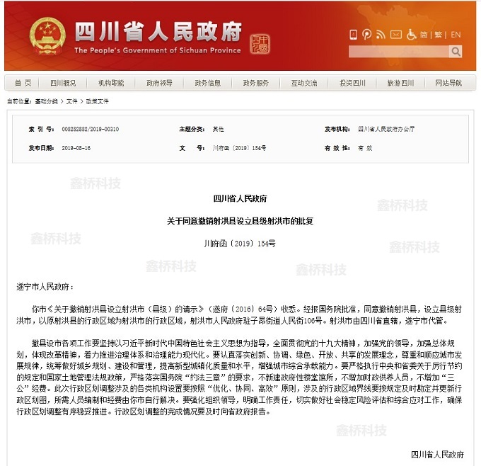 8月16日,四川省人民政府網(wǎng)站公布《四川省人民政府關于同意撤銷射洪縣設立縣級射洪市的批復》(川府函〔2019〕154號)。全文如下
