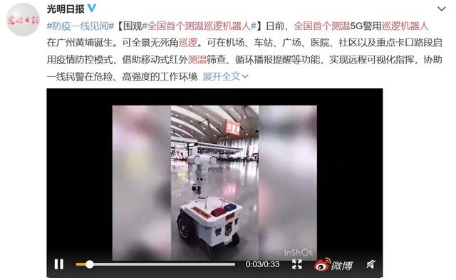援引自光明日報報道,全國首個5G紅外熱成像測溫巡邏機器人警用巡邏機器人在廣州黃埔誕生。
